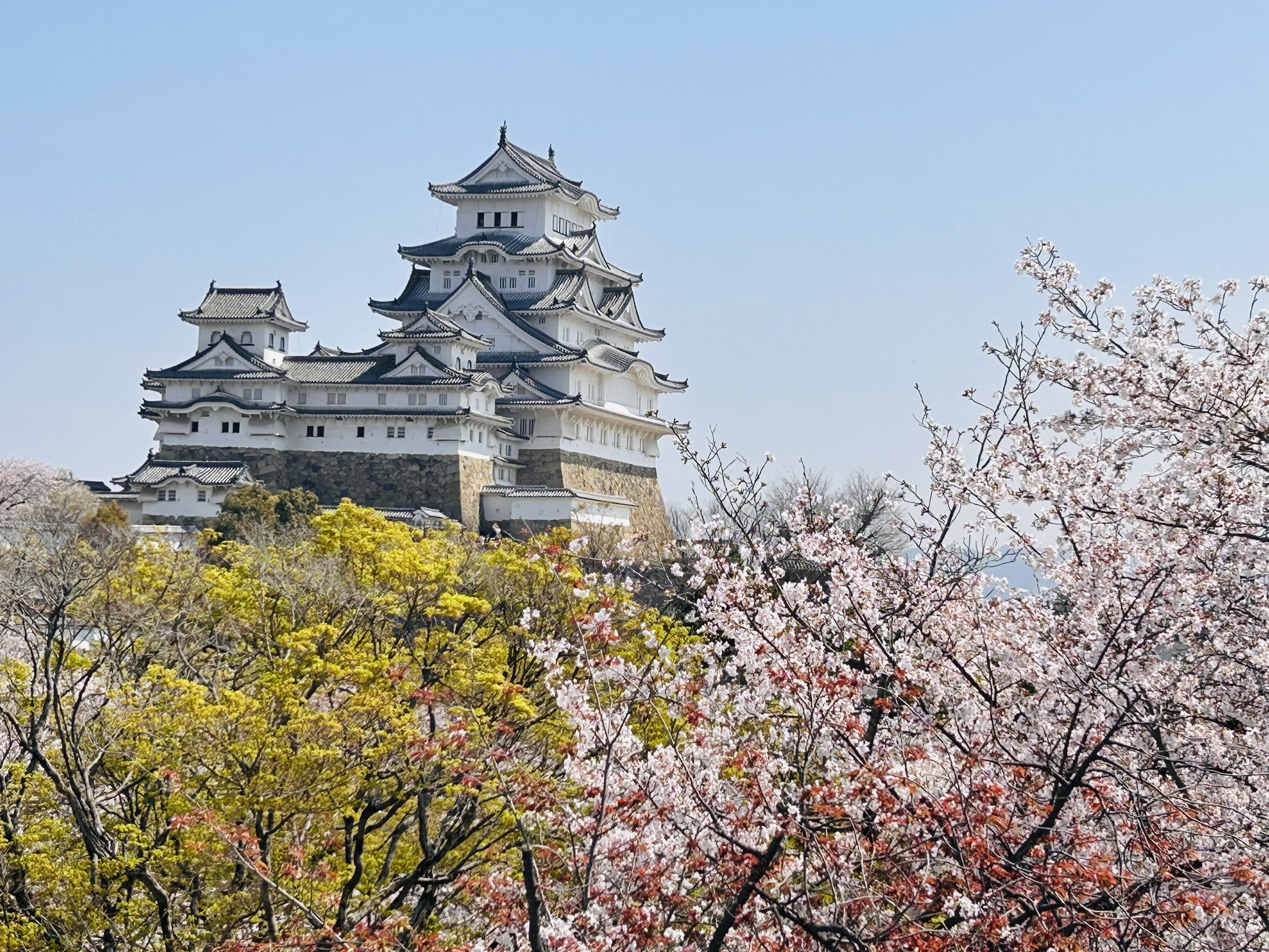 Apprécié sous le surnom de « Château du Héron Blanc » en raison de son élégante silhouette rappelant un héron aux ailes déployées, le château de Himeji se distingue par ses murailles entièrement enduites de plâtre blanc et par son donjon principal de cinq étages et six niveaux (avec un sous-sol), relié par des galeries aux donjons secondaires de l’est, de l’ouest et du nord-ouest, formant un ensemble de donjons interconnectés.